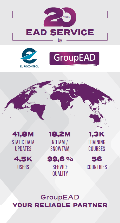 In numbers this means for the 20 years of service provision in partnership with EUROCONTROL: 41,8 million of Static Data Updates, 18,2 million of NOTAM/SNOWTAM processed, 1.300 Training Courses have been provided, 4.500 Airlines, Flight Plan Service Providers, AIS Providers and many more users spread worldwide over 56 Countries, are using daily the EAD system, and GroupEAD achieved an excellent Service Quality of 99,6% based on EURCONTROL Service Level agreement.